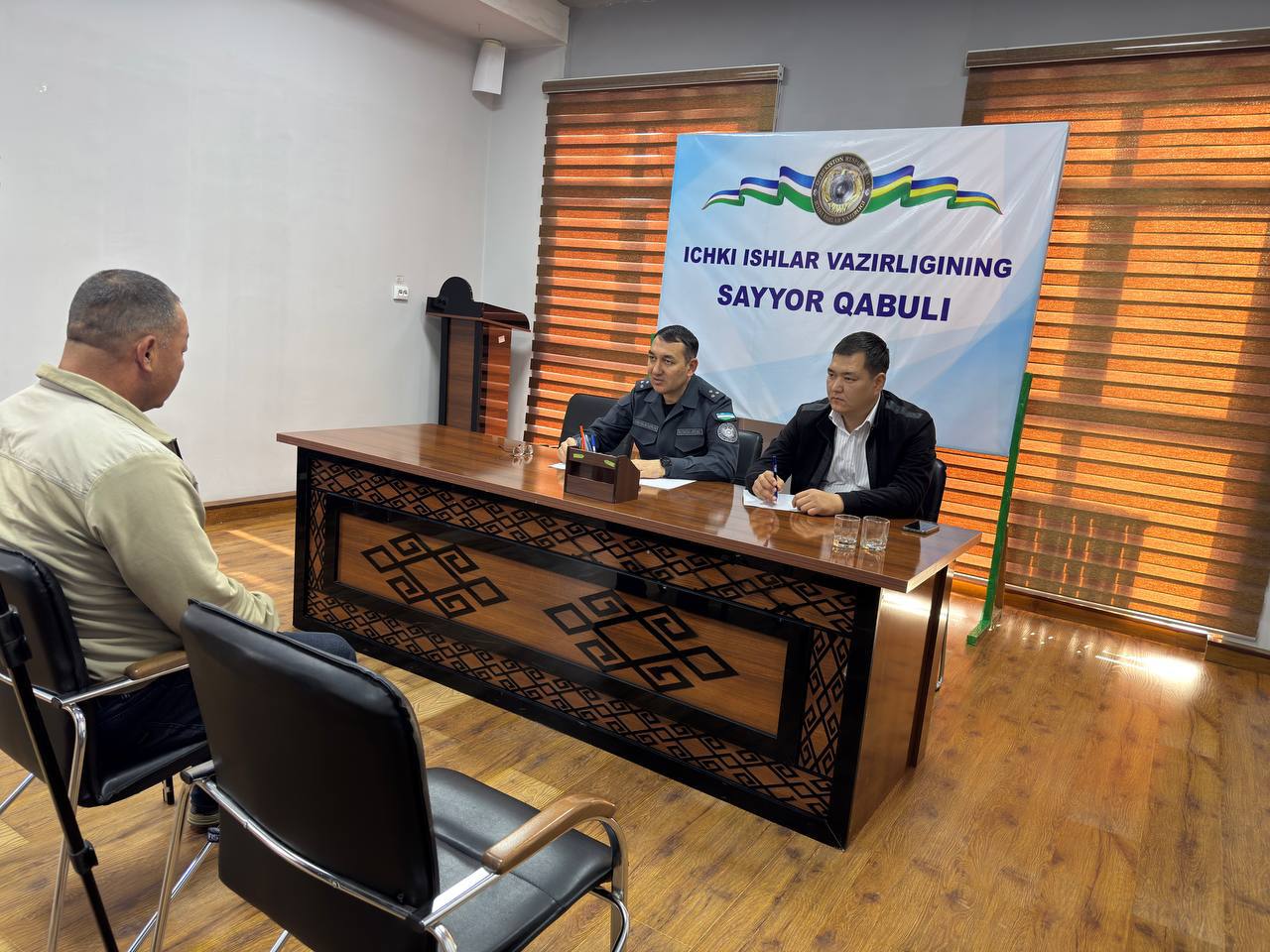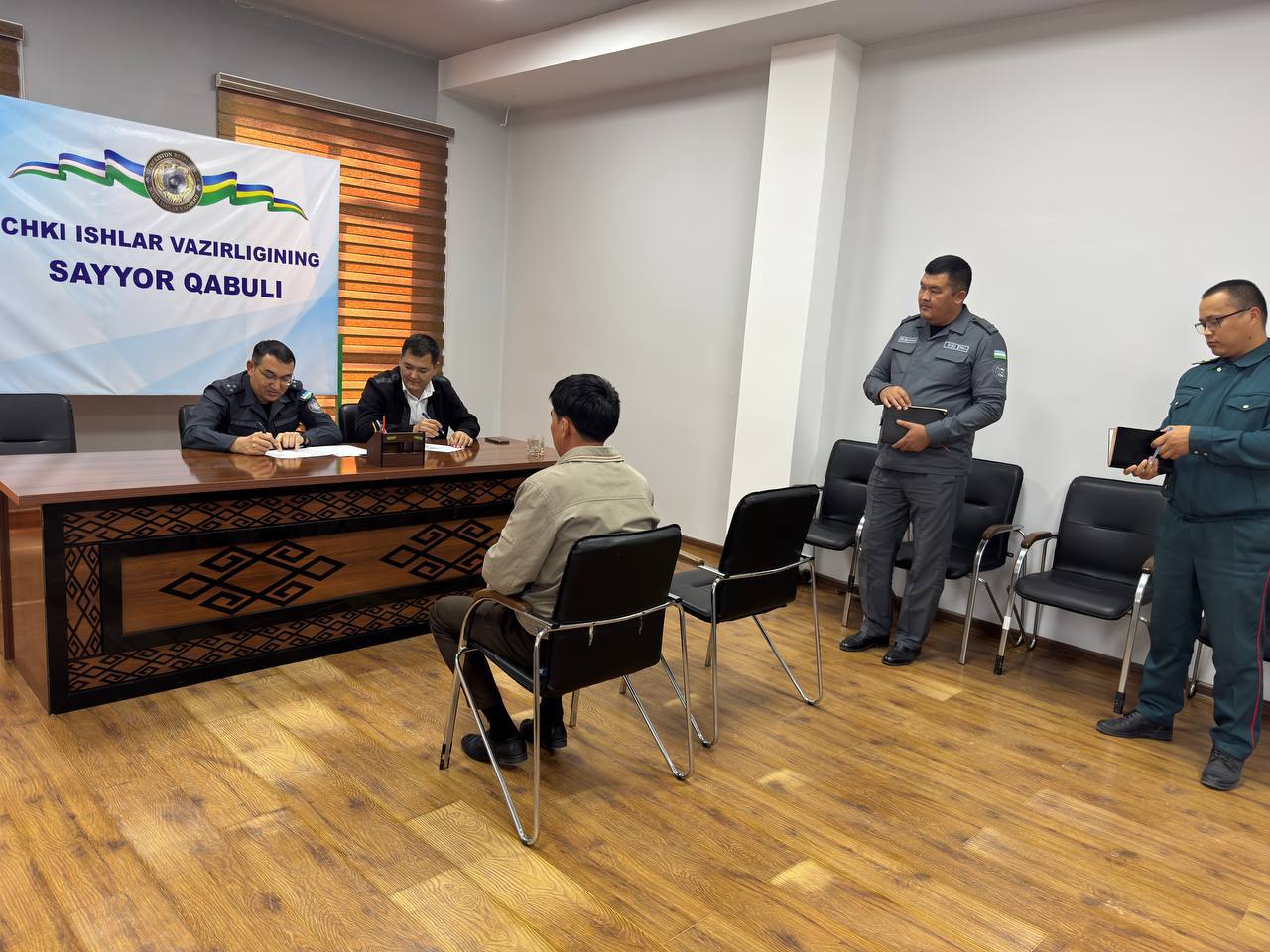 Qaraqalpaqstan Respublikası Ishki isler ministriniń orınbasarı - Tergew basqarması baslıǵı tárepinen fizikalıq hám yuridikalıq táreplerdiń múrájatların kórip shıǵıw, puqaralardıń tarawǵa baylanıslı mashqalalarına unamlı sheshim tabıw maqsetinde Qanlıkól rayonı Xalıq qabıllawxanası imaratında gezektegi Kóshpeli qabıllaw ótkerildi.