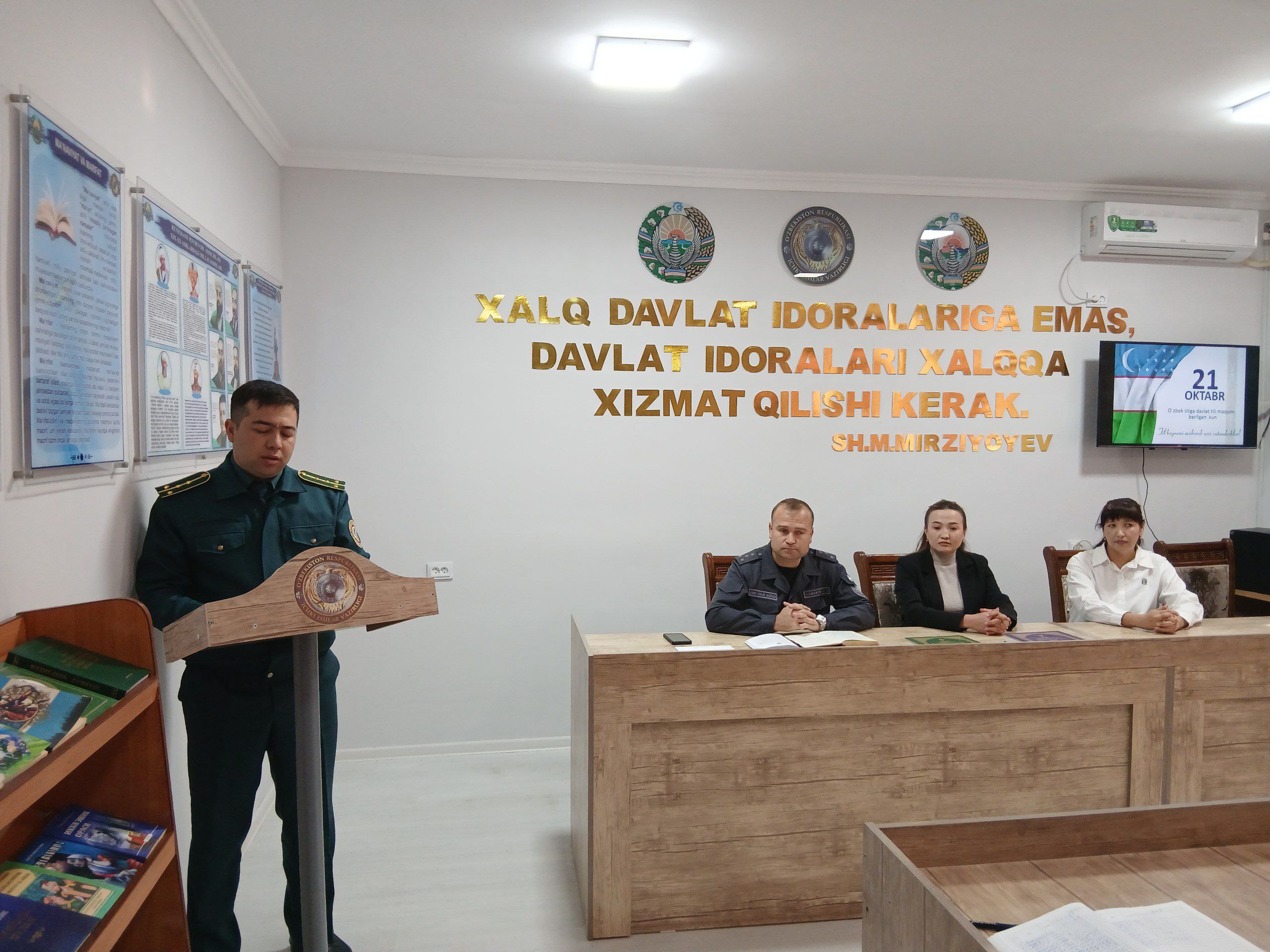 Qaraqalpaqstan Respublikası Ishki isler ministrligi úshinshi regionallıq aymaq, Taqıyatas rayonı Ishki isler bóliminde 21-oktyabr - Ózbekstanda Mámleketlik til bayramı kúnine baǵıshlanǵan "Ózbek tili - anajanım tili bul!" atamasında ruwxıy-aǵartıwshılıq ilaj bolıp ótti. Ilajǵa Taqıyatas rayonı Málimleme kitapxana orayınıń baslıǵı hám Málimleme kitapxana orayınıń qánigesi qatnastı.