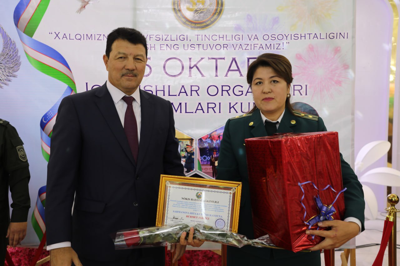 25 октябрь - Ички ишлар ходимлари куни муносабати билан Нукус туманида байрам тантанаси бўлиб ўтди. Байрам тадбирида соҳа фахрийлари ва Ички ишлар ходимларининг вакиллари иштирок этди. Тадбирда туман ҳокими З.Зайтов Ички ишлар соҳаси фидойиларини байрам билан табриклаб, уларнинг жамоат тинчлиги ва хавфсизлигини таъминлашдаги хизматларини юқори баҳолади. Тадбир давомида бир қатор соҳа вакиллари туман ҳокимлиги ва туман прокуратураси номидан фахрий ёрлиқлар билан тақдирланди. Шунингдек, фахрий ходимларга ҳам алоҳида эҳтиром кўрсатилиб, эсдалик совғалари топширилди.